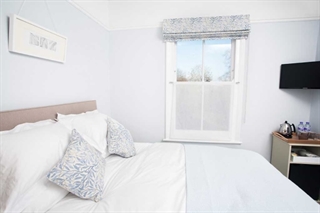 A beautifully appointed bay windowed room at the rear of the house overlooking the lovely garden. Superkingsize bed which can be made into 2 comfortable 90cm/3ft beds. Stunning ensuite bathroom providing a large shower and a wonderful bateau style bath. Free wi-fi, Freeview TV and tea and coffee making facilities including a silent fridge with fresh milk. Please add a note to your booking if you need the room configured as twin beds.